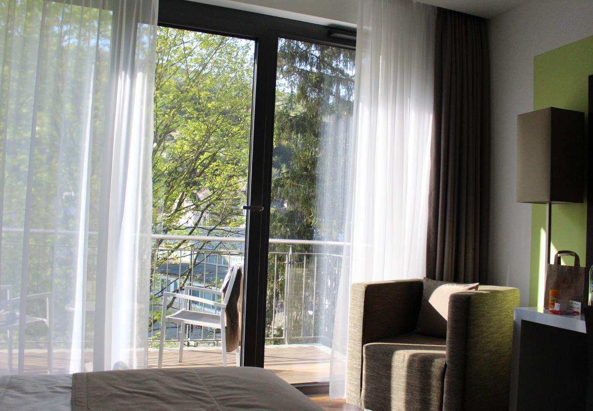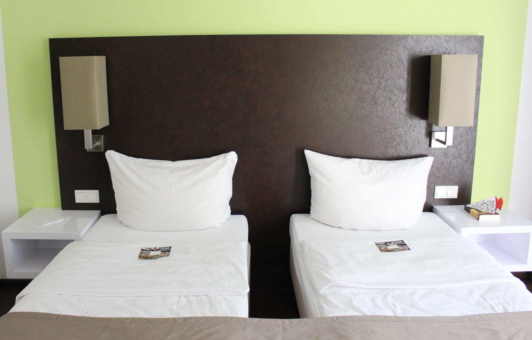 Das Haus ist barrierefrei und ein Aufzug bringt den Gast in jedes Stockwerk, so dass man auch mit schwerem Gepäck problemlos unterwegs ist. Die Flure und die Zimmer sind geräumig (von 23 bis 30 qm) und modern eingerichtet. Der Balkon ist groß genug, um dort die morgendlichen Yoga-Übungen zu machen und vom Bad aus ermöglicht eine Glasfront den Ausblick ins Grüne.