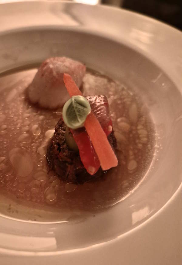 Kombu gebeizter Saibling, Kräuterdashi, Shiromiso, fermentierte Karotte