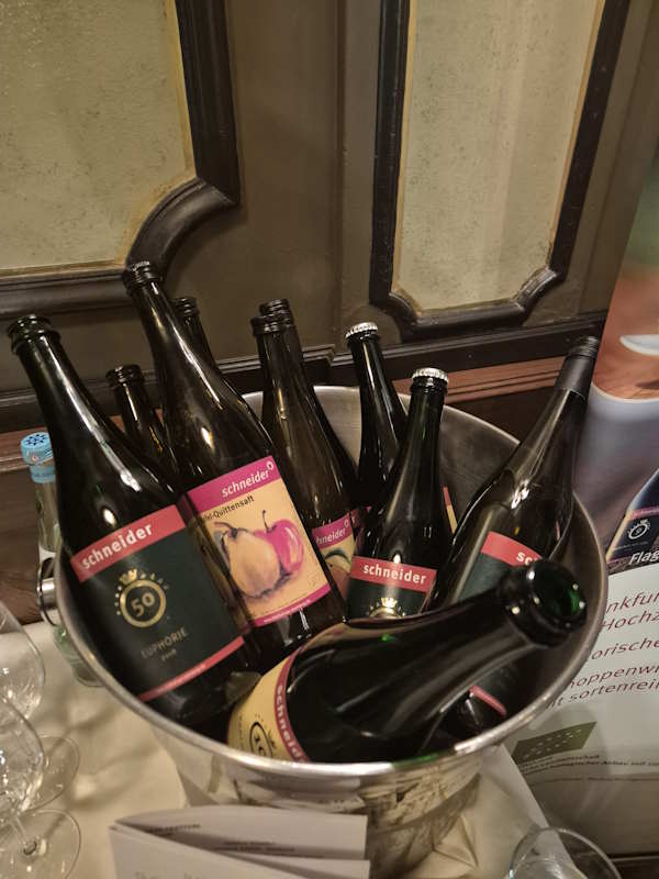 Zum Glück gibt es inzwischen auch ganz exzellente alkoholfreie Drinks, bespielsweise alkoholfreie Speisenbegleiter vom Obsthof am Steinberg (Apfelquitte, Apfelbirne, Birne, 2022 Karcherbirne, 2024 Goldparmäne Alte Bäume, 2018 Euphori)  und von der Manufaktur Jörg Geiger (ViSecco Sauvignon Blanc, TeaSecco, PriSecco, Bio Gin Bitter, Grad Wanderung 35 Sauvignon Blanc, Edition Lamothe), bekannt für exklusive Essige