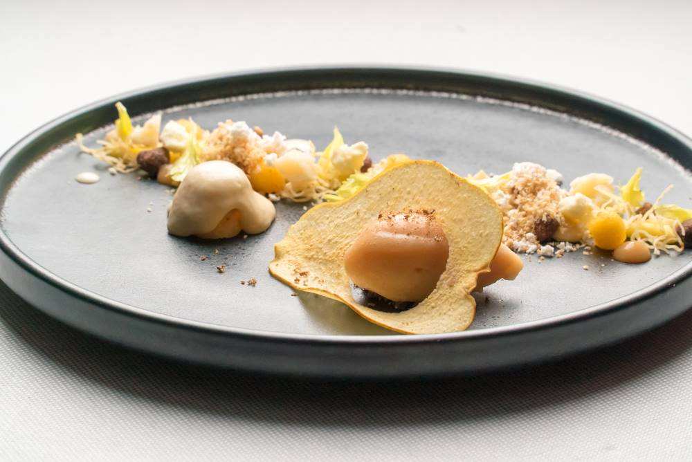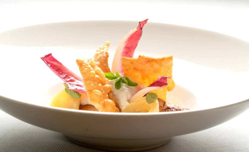 Gebratener, norwegischer Kaiser-Granat mit Macadamia Krustentierbisque mit Kaffirlimette, zweierlei vom Blumenkohl, Erbsen und Yuzu-Paprikachutney