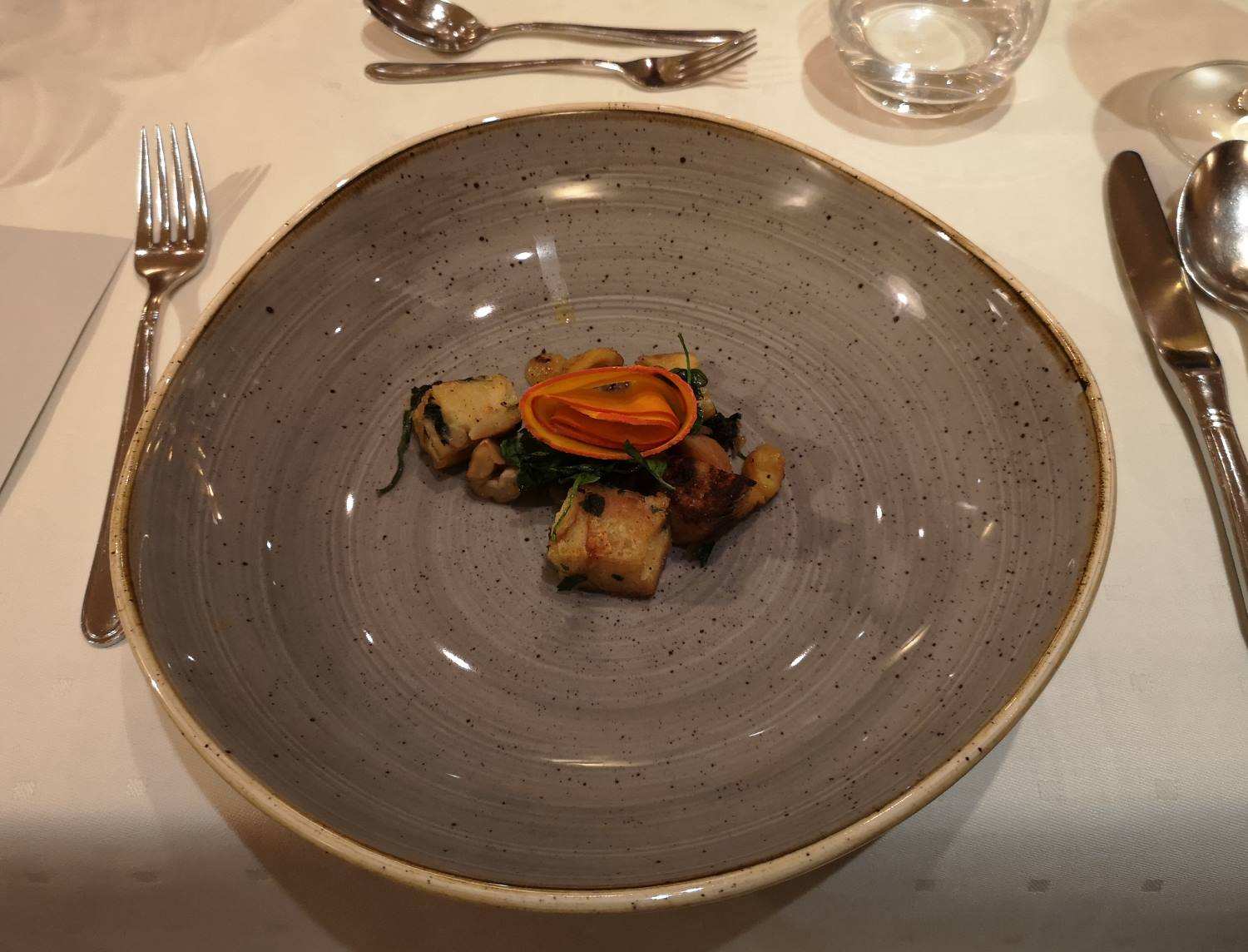 Das Hotel-Restaurant ist von den üblichen Gourmet-Führern empfholen: „Gault Millau“, BiB Gourmand oder auch der Varta Führer sind begeistert und so kommen die Gäste aus der ganzen Republik. Neben mir, Stammkunden aus Köln, die seit Jahren auch Silvester im Weingut feiern. Ja klar, eine schöne Idee! Das Menü beim Event lässt keine Wünsche offen und das ist kein Wunder, denn ich treffe Küchenkollegen aus verschiedenen Sterne-Küchen. Zunächst Tobias Datow, der schon im Team von Michael Kammermeier im Sterne-Restaurant ENTE in Wiesbaden gekocht hat. Chef de Cuisine seit 2017 ist Aljoscha Freitag, früher auch bei Christian Bau (3-Sterne) tätig. Genau diese ambitionierte Küchenkunst spiegelt sich in den Tellern wieder. Klasse, wenn die Küche so viel Spaß hat und die Gäste davon profitieren. Der sympathische Jens Gaffga, Chef de Rang, servierte mit seiner Kollegin ein Highlight nach dem anderen.