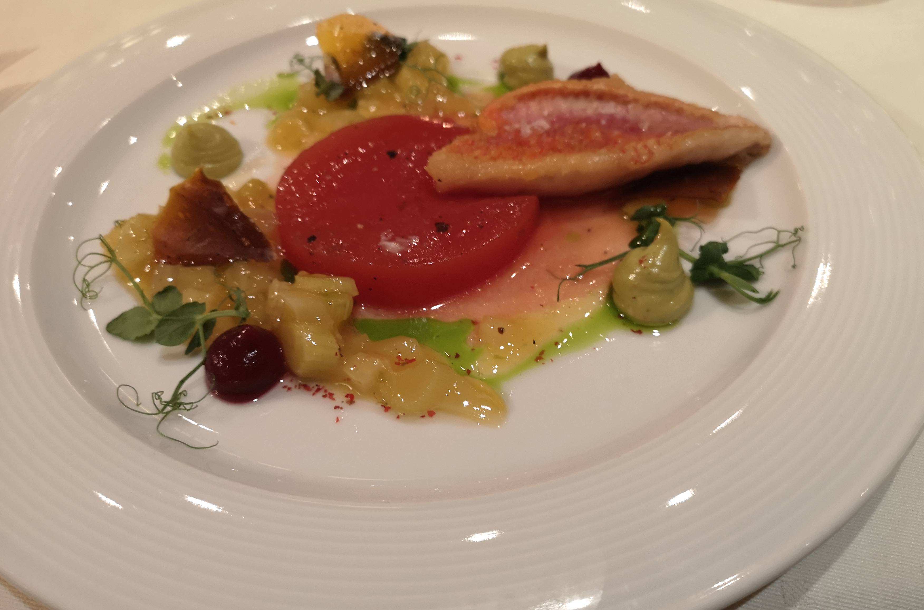 Wir starten mit einer Felsenrotbarbe mit Tomatenmousse und Orangenfenchel