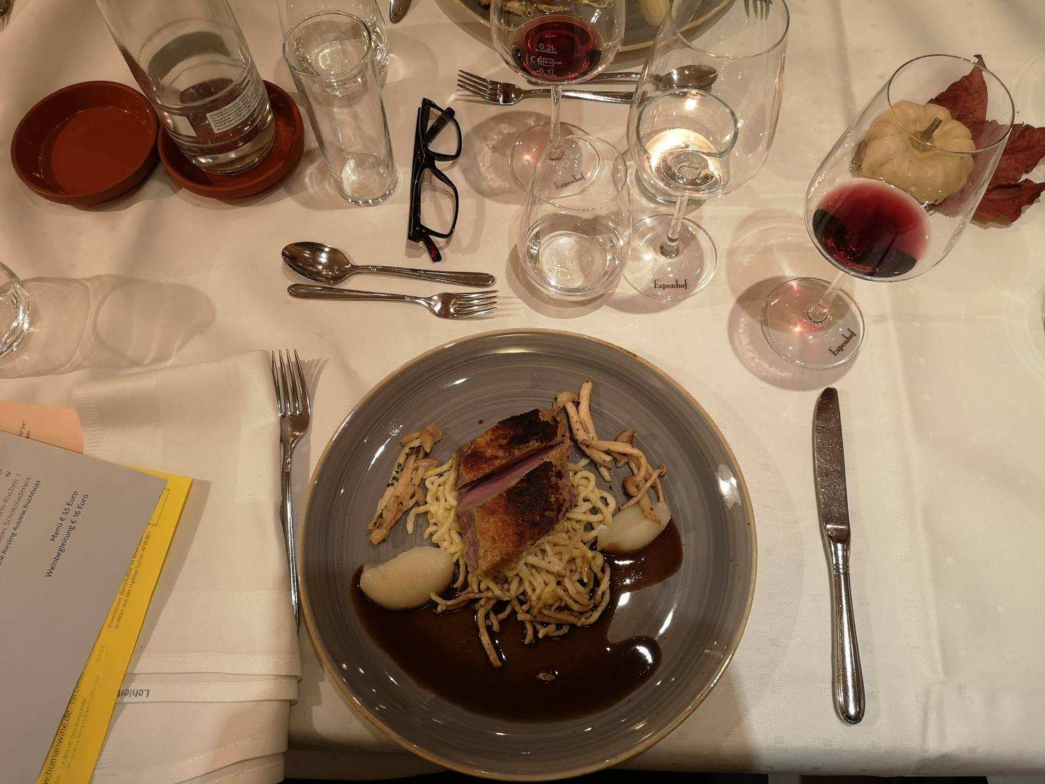 Was ist das Besondere an rheinhessischen Weinen? Was sind die Lieblingsrebsorten der jeweiligen Winzer? Wo sind die Weine gewachsen und welchen Einfluss hat das Terroir? Diese und viele weitere Fragen können beim Winemakers Dinner in entspannter Atmosphäre gestellt werden. Im Espenhof hatten wir die Möglichkeit, diese Fragen rund um den Wein mit dem Winzer persönlich zu besprechen und in entspannter Runde habe ich viel über die neuen und alten Sorten gelernt. Ganz besonders auch von der Scheurebe, die so typisch ist für Rheinhessenwein und vom Espen… auch also Orange Wine ausgebaut wurde. Spannend!