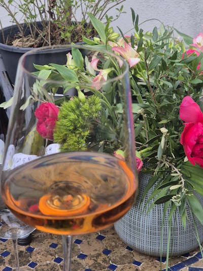 Wir beschließen den alkoholfreien Abend mit einem moussierenden Rosé zum Dessert, einem feinen Crepes. Ich hatte mich in der Küch verquatscht, deshalb ist das Eis zerlaufen und nicht mehr ganz so fotogen. Doch es war fantastisch, und mit wenig Süße, weder im Glas noch auf dem Teller, sondern fruchtig und elegant. Wunderbar schwingt das Getränk zur Nachspeise, nichts beschwert und der Geist ist weiterhin wach.
