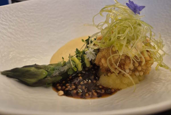 Grüner Spargel – gebackenes Kalb – Kartoffel – Hollandaise – Haselnüsse