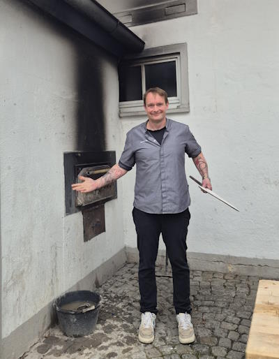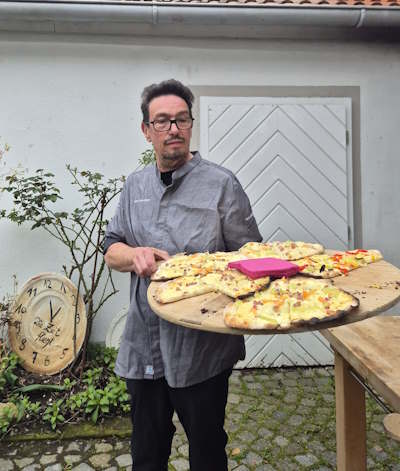 Bis alle Gäste eingetroffen sind, gibt’s im Hof ein paar Kleinigkeiten und Küchenchef Christian Stahl* steht selbst am Pizzaofen, während sein Teamkollege den Gästen den leckeren Flammkuchen serviert.