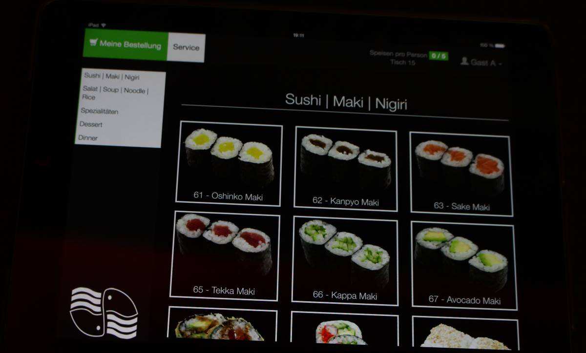 Zwischen Bürogebäude und Sexshop war hier jahrzehntelang ein Grill-Restaurant, jetzt weht hier ein anderer Wind: Asiatisch! Man wird sehr freundlich in Empfang genommen und steht auch schon gleich vor dem Sushi-Meister in traditioneller Tracht. Schönes Detail! Montagabend. Der Gastraum ist schon gut gefüllt. Zum Bestellen bringt uns die Bedienung die notwendigen iPads.